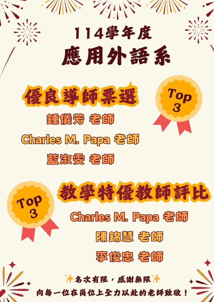 Post author:助理 Post published:2026-04-07 Post category:最新消息 / 系所公告 在應外系,每位老師都在用自己的方式定義優質教學。 我們知道,那些不在榜上的專業與付出,同樣都是撐起全系的強大力量。 謝謝每位老師,你們都是最正點的後援! You Might Also Like 【大四校外實習分享】學長姐回娘家 傳授寶貴實習心得 2025-05-23 說說唱唱,與汪汪共學ABC (陪讀犬共讀生命教育) 2020-10-22 📣【演講快報!搶先報名🔥】你對 AI 有興趣嗎?想知道怎麼跟 AI 一起創作圖文嗎?那這場演講你絕對不能錯過!👀 2025-03-21