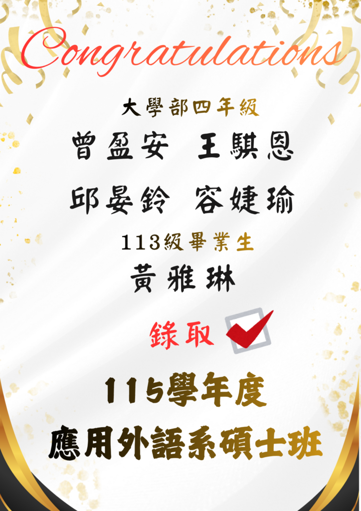 Post author:助理 Post published:2026-04-08 Post category:最新消息 / 校友資訊 / 系所公告 You Might Also Like 110學年度應外系碩士班甄試招生中 2020-12-24 📣【演講快報!搶先報名🔥】你對 AI 有興趣嗎?想知道怎麼跟 AI 一起創作圖文嗎?那這場演講你絕對不能錯過!👀 2025-03-21 大寫的優秀!這些老師的課與關懷,我們收到了! 2026-04-07